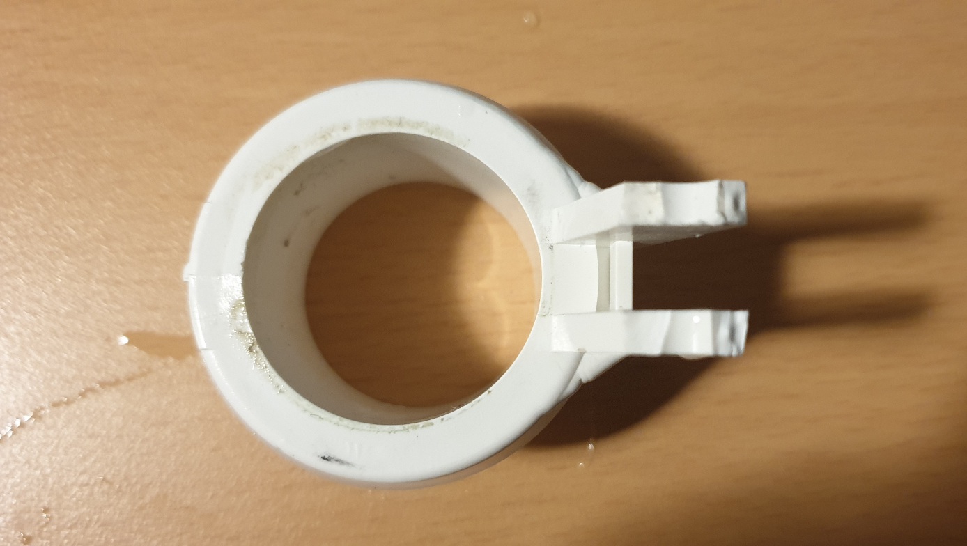 버튼이 눌러졌을때 레버가 저 깨진 부분에 끼어서 회전을 할 수 있어야 하는데 한쪽은 완전히 깨졌고 다른 한쪽은 금이 가있었기에 그냥 빠져버린 겁니다. 오랜 시간 물속에 잠겨 있으니 플라스틱의 물성이 변해서 약해진 모양입니다.