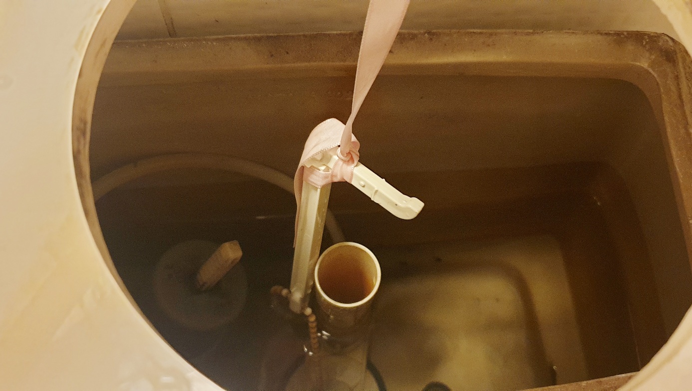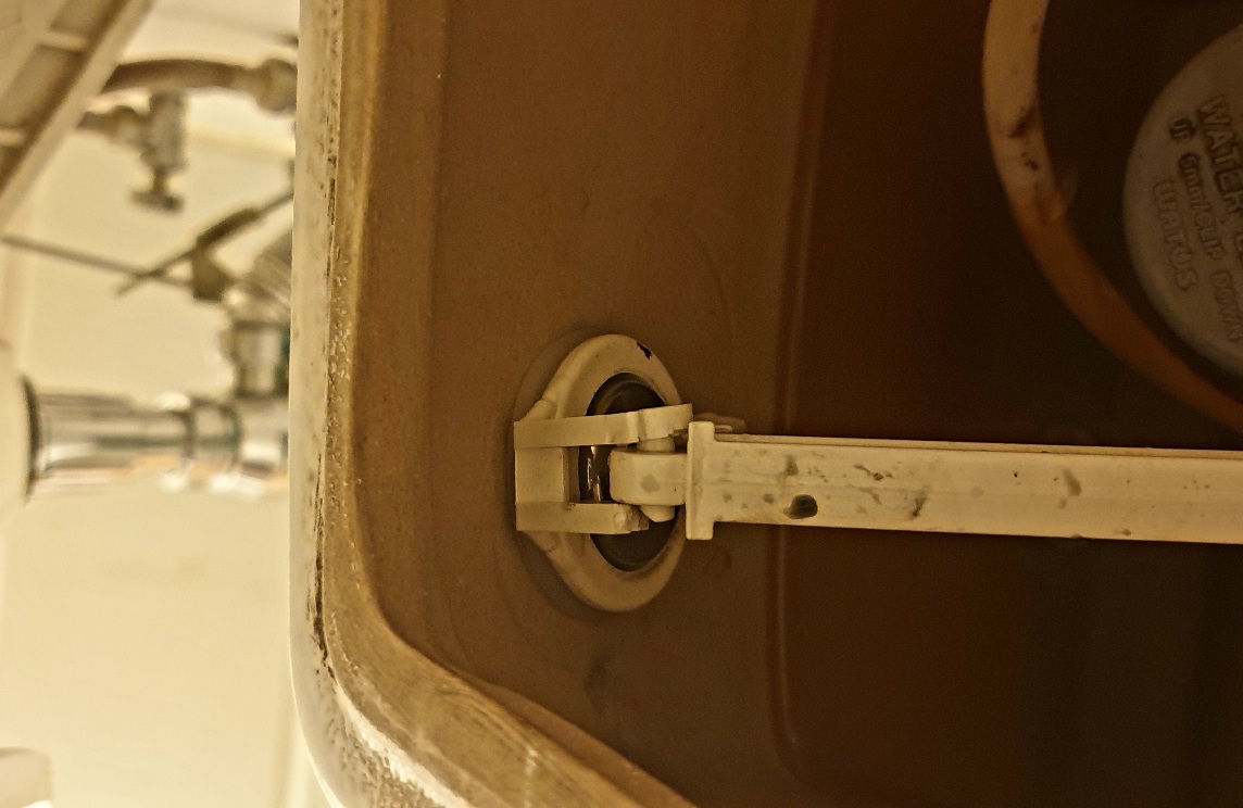 밤이 늦어 부품을 사러 갈 수 없으니 리본을 레버 끝에 묶어 응급조치를 해둡니다. 버튼을 누르면 사진 속 오른쪽의 짧은 부분을 버튼이 누르면서 패킹으로 닫혀있던 배수구를 열어서 물을 내려보내는 것입니다. 버튼과 레버가 하던 일을 직접 우리 손으로 하는 응급조치입니다^^. 리본을 잡아당기면 물이 내려갑니다. 물이 다시 차오르는 것도 문제가 없으니 응급조치 완료합니다.
