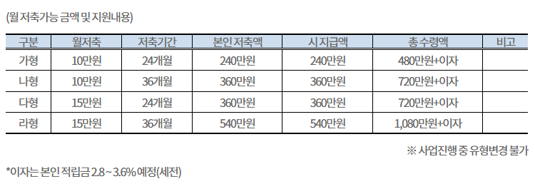 월 저축액과 저축기간 등 조건에 따라 가형에서 라형까지 네 가지의 유형이 있습니다. 자세한 내용은 아래의 사진을 보세요. 사업진행 중에 유형 변경은 불가합니다. 통장개설 및 저축 방법, 신청자 금융교육 등 더 자세한 내용은 맨 아래 링크를 클릭하셔서 참고하세요.